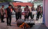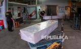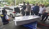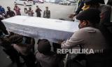 Petugas Kepolisian Polda Kepri menurunkan peti berisi jenazah Tenaga Kerja Indonesia (TKI) dari mobil ambulans di Terminal Kargo Bandara Hang Nadim Batam, Kepulauan Riau, Rabu (5/1/2022). Sebanyak delapan jenazah TKI ilegal korban kapal karam di Perairan Johor Bahru, Malaysia beberapa waktu lalu akan dipulangkan ke daerah asal melalui jalur udara. (FOTO : Antara/Teguh Prihatna)
