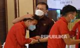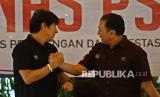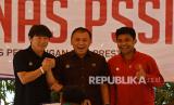 REPUBLIKA.CO.ID, JAKARTA -- Ketua Umum PSSI Mochamad Iriawan (tengah) menjabat tangan pelatih Shin Tae-yong (kiri) dan pesepak bola Asnawi Mangkualam (kanan) dalam acara pelepasan Timnas Indonesia dalam Piala AFF 2020 usai karantina di Hotel Sultan, Jakarta, Kamis (6/1/2022). Dalam acara tersebut PSSI membubarkan tim yang merebut juara kedua Piala AFF 2020 dan selanjutnya akan segera membentuk tim yang akan berlaga dalam Piala AFF U-23 di Kamboja pada 14-26 Februari 2022.