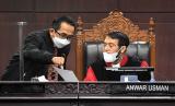 Ketua Majelis Hakim Konstitusi (MK) Anwar Usman (kanan) berbicara dengan panitera di sela sidang pengujian materiil Undang-undang Nomor 7 Tahun 2017 tentang Pemilhan Umum di Mahkamah Konstitusi, Jakarta, Kamis (6/1/2022). Sidang tersebut digelar atas permohonan dari politikus Partai Gerindra Ferry Yuliantono yang meminta ‘presidential threshold’ diturunkan dari 20 persen jadi 0 persen karena menilai aturan itu dinilai menguntungkan dan menyuburkan oligarki. (FOTO : ANTARA/Aditya Pradana Putra)