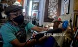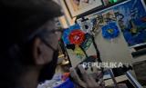 Seniman Teguh Joko Dwiyono menunjukkan kemampuannya merangkai limbah plastik menjadi sebuah lukisan di workshop sekaligus galeri miliknya di Rawamangun, Jakarta, Jumat (7/1). Kreatifitas pengolahan limbah sampah plastik menjadi karya seni ini diharapkan mampu mengatasi permasalahan sampah plastik khusunya di lingkungan rumah tangga. Dwiyono juga mengajarkan Kreatifitas tersebut kepada ibu-ibu PKK demi menjaga lingkungan. (FOTO : Prayogi/Republika.)