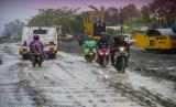 Pengendara sepeda motor melintasi Jalan Trans Kalimantan yang rusak di Kecamatan Liang Anggang, Banjarbaru, Kalimantan Selatan, Jumat (7/1/2022). Proyek rehabilitasi Jalan Ahmad Yani Lianganggang Kota Banjarbaru hingga batas Kabupaten Tanah Laut yang menelan anggaran sebesar Rp74 miliar itu hingga kini tak kunjung selesai dan telah melewati batas waktu pengerjaan yang seharusnya yaitu pada 31 Desember 2021 lalu dan berdampak pada ekonomi masyarakat setempat. (FOTO : ANTARA/Bayu Pratama S)