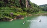 Pengunjung bermain Stand Up Paddle di Sungai Oyo, Selopamioro, Imogiri, Bantul, DI Yogyakarta, Jumat (7/1/2022). Aliran Sungai Oyo yang terletak di antara perbukitan dengan bentang alam yang indah tersebut menjadi potensi wisata alam di Kabupaten Bantul. (FOTO : ANTARA/Hendra Nurdiyansyah)