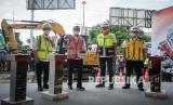 Menteri Perhubungan Budi Karya Sumadi (kedua kiri), Gubernur Jawa Tengah Ganjar Pranowo (kedua kanan), Direktur Jenderal Bina Marga Kementerian PUPR Hedy Rahadian (kanan) dan Wali Kota Solo Gibran Rakabuming Raka (kiri) menghadiri acara Peletakan Batu Pertama Pembangunan Jalur Rel Ganda dan Rel Layang Simpang Joglo di Solo, Jawa Tengah, Sabtu (8/1/2022). Kementerian Perhubungan akan membangun jalur rel kereta api ganda tahap I sepanjang 10 km dari Stasiun Balapan sampai Kalioso dengan anggaran sekitar Rp920 milliar yang dilengkapi konstruksi elevated rail atau rel layang di simpang Joglo untuk mengatasi kemacetan. (FOTO : Antara/Mohammad Ayudha)