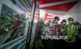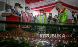Menteri Perhubungan Budi Karya Sumadi (kedua kiri), Gubernur Jawa Tengah Ganjar Pranowo (kanan), Direktur Jenderal Bina Marga Kementerian PUPR Hedy Rahadian (kedua kanan) dan Wali Kota Solo Gibran Rakabuming Raka (ketiga kiri) melihat maket proyek pembangunan rel layang saat acara Peletakan Batu Pertama Pembangunan Jalur Rel Ganda dan Rel Layang Simpang Joglo di Solo, Jawa Tengah, Sabtu (8/1/2022). Kementerian Perhubungan akan membangun jalur rel kereta api ganda tahap I sepanjang 10 km dari Stasiun Balapan sampai Kalioso dengan anggaran sekitar Rp920 milliar yang dilengkapi konstruksi elevated rail atau rel layang di simpang Joglo untuk mengatasi kemacetan. (FOTO : Antara/Mohammad Ayudha)