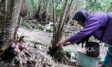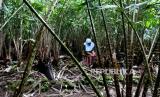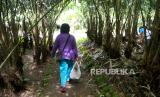 Petani salak melakukan perawatan tanaman di perkebunan salak Turi, Sleman, Yogyakarta, Senin (10/1). Salak Pondok hasil dari petani Turi sudah menjangkau pasar ekspor. Untuk 2021 lalu ekspor salak mencapai 160 ton dan turun imbas pandemi Covid-19. Salak Pondok yang diekspor merupakan hasil berkebun secara organik. Di tingkat petani salak pondoh kualitas ekspor dihargai Rp 5 ribu perkilogram. (FOTO : Wihdan Hidayat / Republika)