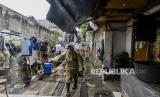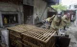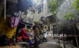 Petugas menyemprotkan cairan disinfektan di kawasan Krukut, Taman Sari, Jakarta, Senin (10/1). Ditargetkan sebanyak 500 warga mengikuti tes usap massal Covid-19 pasca ditemukannya 36 warga yang positif Covid-19 hingga membuat 4 RT melakukan mikro lockdown. Republika/Putra M. Akbar (FOTO : Republika/Putra M. Akbar)