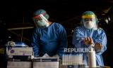 Petugas kesehatan bersiap melakukan tes usap kepada warga di kawasan Krukut, Taman Sari, Jakarta, Senin (10/1). Ditargetkan sebanyak 500 warga mengikuti tes usap massal Covid-19 pasca ditemukannya 36 warga yang positif Covid-19 hingga membuat 4 RT melakukan mikro lockdown. Republika/Putra M. Akbar (FOTO : Republika/Putra M. Akbar)