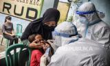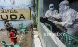 Petugas kesehatan melakukan tes usap kepada seorang anak di kawasan Krukut, Taman Sari, Jakarta, Senin (10/1). Ditargetkan sebanyak 500 warga mengikuti tes usap massal Covid-19 pasca ditemukannya 36 warga yang positif Covid-19 hingga membuat 4 RT melakukan mikro lockdown. Republika/Putra M. Akbar (FOTO : Republika/Putra M. Akbar)