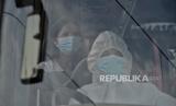 Pasien Covid-19 berada di dalam bis sebelum memasuki Rumah Sakit Darurat Covid-19 (RSDC) Wisma Atlet, Kemayoran, Jakarta, Senin (10/1). Jumlah pasien terkonfirmasi positif covid-19 di RSDC Wisma Atlet sebanyak 1.978 orang atau bertambah 140 orang dari sebelumnya 1.838 orang, sementara menurut Juru Biara Pemerintah untuk penanganan Covid-19, bed occupancy rate (BOR) mencapai 53,82 persen di tower 5 dan 6 RSDC Wisma Atlet Kemayoran. (FOTO : Republika/Thoudy Badai)