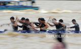 Peserta lomba pacu perahu beradu cepat di Sungai Batanghari, Jambi, Ahad (9/1/2022). Kegiatan pacu perahu yang dirangkai dengan lomba perahu hias dalam rangka memeriahkan Hari Jadi ke-65 Provinsi Jambi itu diikuti puluhan perwakilan klub dan instansi. (FOTO : ANTARA/Wahdi Septiawan)
