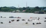 Sejumlah perahu dari peserta lomba pacu perahu dan pendamping bersiap di Sungai Batanghari, Jambi, Ahad (9/1/2022). Kegiatan pacu perahu yang dirangkai dengan lomba perahu hias dalam rangka memeriahkan Hari Jadi ke-65 Provinsi Jambi itu diikuti puluhan perwakilan klub dan instansi. (FOTO : ANTARA/Wahdi Septiawan)