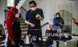 Praktisi kopi Fransikus Satriawan menuangkan kopi kepada anak berkebutuhan khusus di The Home, Cilandak, Jakarta, Selasa (11/1). Pelatihan membuat kopi tersebut untuk memberikan pembekalan wirausaha kepada anak berkebutuhan khusus setelah menyelesaikan pendidikan di Sekolah Luar Biasa (SLB). Republika/Putra M. Akbar (FOTO : Republika/Putra M. Akbar)