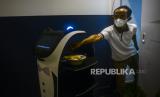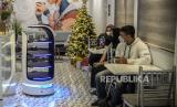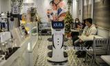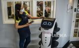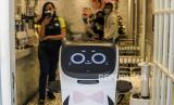 REPUBLIKA.CO.ID, JAKARTA -- Pekerja mengoperasikan robot pramusaji bernama Kitty di Jakarta, Rabu (12/1). Inovasi penggunaan robot pramusaji itu untuk memberikan kenyamanan bagi para pelanggan dalam mengurangi sentuhan fisik pada masa pandemi Covid-19.