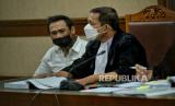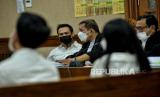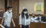 Terdakwa musisi I Gede Ari Astina alias Jerinx (kiri) saat menjalani sidang terkait kasus dugaan pengancaman dengan kekerasan di Pengadilan Negeri (PN) Jakarta Pusat, Rabu (12/1). Sidang tersebut beragendakan pemeriksaan saksi yang di hadirkan jaksa penuntu umum (JPU) diantaranya pelapor sekaligus pegiat media sosial Adam Deni. Republika/Thoudy Badai (FOTO : Republika/Thoudy Badai)
