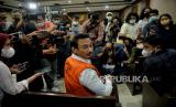Terdakwa musisi I Gede Ari Astina alias Jerinx melepas pakaian tahanannya saat menjalani sidang terkait kasus dugaan pengancaman dengan kekerasan di Pengadilan Negeri (PN) Jakarta Pusat, Rabu (12/1). Sidang tersebut beragendakan pemeriksaan saksi yang di hadirkan jaksa penuntu umum (JPU) diantaranya pelapor sekaligus pegiat media sosial Adam Deni. Republika/Thoudy Badai (FOTO : Republika/Thoudy Badai)