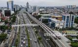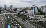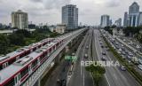 REPUBLIKA.CO.ID, JAKARTA -- Foto udara gerbong kereta Light Rail Transit (LRT) terparkir di jalur Pancoran, Jakarta, Rabu (12/1/2022). Progres perkembangan pembangunan transportasi Lintas Rel Terpadu atau LRT yang akan melintas di Jakarta - Bogor - Depok - Bekasi (Jabodebek) tersebut sudah mencapai 88,60 persen, saat ini telah memasuki tahapan uji coba atau tahapan testing commisioning (tes fungsi) untuk rute Pancoran-Dukuh Atas.