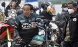 REPUBLIKA.CO.ID,LOMBOK TENGAH -- Presiden Joko Widodo mengendarai sepeda motor custom Kawasaki W175 bergaya chopper bobber di Jalan Bypass BIL-Mandalika, Desa Kuta, Kecamatan Pujut, Praya, Lombok Tengah, NTB, Kamis (13/1/2022).