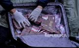Barang bukti diperlihatkan saat konferensi pers pengumuman dan penahanan tersangka di Gedung KPK Merah Putih, Jakarta, Kamis (13/1). KPK resmi menetapkan tersangka sekaligus melakukan penahanan kepada Bupati PPU Abdul Gafur Masmengamankan barang bukti berupa uang tunai Rp1 Miliar dan rekening bank Rp447 juta. (FOTO : Republika/Thoudy Badai)