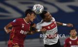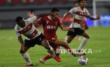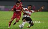 REPUBLIKA.CO.ID, GIANYAR -- Pesepak bola Bhayangkara FC Evan Dimas Darmono (kiri) berebut bola dengan pemain Madura United Haris Tuharea dalam pertandingan sepak bola Liga 1 di Stadion I Wayan Dipta, Gianyar Bali, Jumat (14/1/2022). Bhayangkara FC berhasil mengalahkan Madura United dengan skor 3-2. Dengan kemenangan ini Bhayangkara berda di peringkat dua klasemen terpaut selisih gol dengan pemuncak Arema FC