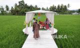 Sejumlah wisatawan berfoto di Desa Wisata Sejahtera Bulango Selatan, Kabupaten Bone Bolango, Gorontalo, Sabtu (15/1/2022). Objek wisata baru tersebut menyajikan suasana dan pemandangan persawahan yang dilengkapi dengan kolam pancing, gazebo, serta kuliner lokal bagi wisatawan. (FOTO : Antara/Adiwinata Solihin)