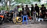 Peserta menservis sepeda motornya sebelum mengikuti ajang Street Race Polda Metro Jaya di Ancol, Jakarta, Ahad (16/1/2022). (FOTO : Republika/Thoudy Badai)
