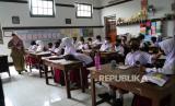 REPUBLIKA.CO.ID, YOGYAKARTA -- Siswa mengikuti pembelajaran tatap muka (PTM) di SDN Lempuyangwangi, Yogyakarta, Senin (17/1/2022). Pemerintah Kota Yogyakarta hingga kini belum menerapkan PTM 100 persen karena menunggu evaluasi PTM 70 persen. Rencananya PTM 100 persen akan diberlakukan pada 24 Januari mendatang.