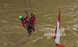 REPUBLIKA.CO.ID, DEPOK -- Pengunjung mencoba wahana permainan Bridge Jump di area Komunitas Ciliwung Panus, Depok, Jawa Barat, Minggu (16/1/2022). Wahana uji adrenalin melompat dengan tali dari atas jembatan setinggi 30 meter di atas sungai Ciliwung tersebut dibuka sebulan sekali pada akhir pekan dengan biaya Rp60 ribu per orang dan menjadi wisata alternatif bagi warga setempat.