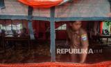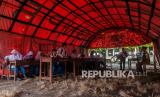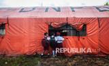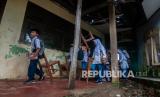 REPUBLIKA.CO.ID, PANDEGLANG -- Siswa melihat proses kegiatan belajar mengajar di dalam tenda darurat di MTs Mathlahul Anwar Sumur, Pandeglang, Banten, Senin (17/1/2022).