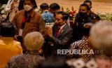 Presiden Joko Widodo (tengah) menyapa sejumlah tamu undangan usai menyampaikan Presidential Lecture (kuliah Umum) pada puncak Dies Natalies ke-67 Universitas Katolik Parahyangan (Unpar) di Auditorium Gedung Pusat Pembelajaran Arntz-Geise (PPAG) Unpar, Bandung, Jawa Barat, Senin (17/1/2022). Selain memberi kuliah umum yang mengangkat tema Pancasila Kekuatan Rakyat dan Keindahan Tradisi tersebut, Presiden Joko Widodo meresmikan gedung Pusat Pembelajaran Arntz-Geise (PPAG) kampus Unpar. (FOTO : Antara/Novrian Arbi)