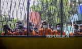 Sejumlah tersangka dihadirkan saat rilis pemusnahan barang bukti narkoba di RSPAD Gatot Subroto, Jakarta, Selasa (18/1/2022). Bareskrim Polri memusnahkan 244 kilogram sabu, 13,8 kilogram ganja, 90 kilogram ekstasi dan 47.500 butir erimin/H-5 yang diperoleh dari hasil pengungkapan kasus bulan Desember 2021 sampai 2 Januari 2022. Republika/Putra M. Akbar (FOTO : Republika/Putra M. Akbar)