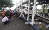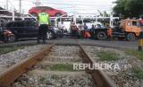 REPUBLIKA.CO.ID, Truk pengangkut mobil tersangkut pada perlintasan kereta api di Kelurahan Balowerti, Kota Kediri, Jawa Timur, Selasa (18/1/2022).