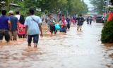 Warga melintasi banjir di Desa Kedawung, Grati, Pasuruan, Jawa Timur, Selasa (18/1/2022). Hujan deras dengan intensitas tinggi tersebut mengakibatkan belasan desa di tiga kecamatan wilayah timur Kabupaten Pasuruan terendam banjir dengan ketinggian hingga satu meter. (FOTO : Antara/Umarul Faruq)