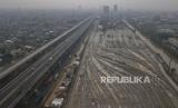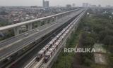 REPUBLIKA.CO.ID,BEKASI -- Foto udara kereta LRT (Light Rail Transit) terparkir di Bekasi, Jawa Barat, Selasa (18/1/2022).