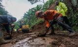 REPUBLIKA.CO.ID, PEKALONGAN-- Sejumlah anggota TNI Kodim 0710 Pekalongan bersama petugas Badan Penanggulangan Bencana Daerah (BPBD) dan relawan membersihkan material longsor tanah yang menutupi jalan di Dukuh Tinalum, Kayupuring, Kecamatan Petungkriyono, Kabupaten Pekalongan, Jawa Tengah, Rabu (19/1/2022).