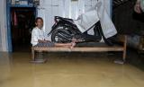 Seorang warga duduk di halaman rumahnya yang terendam banjir di Pakuhaji, Kabupaten Tangerang, Banten, Kamis (20/1/2022). Intensitas hujan yang tinggi sejak Selasa (18/1) menyebabkan empat kampung di kecamatan tersebut terendam banjir dan mengakibatkan 660 KK terdampak. (FOTO : ANTARA/FAUZAN)