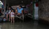 Warga duduk di halaman rumahnya yang terendam banjir di Pakuhaji, Kabupaten Tangerang, Banten, Kamis (20/1/2022). Intensitas hujan yang tinggi sejak Selasa (18/1) menyebabkan empat kampung di kecamatan tersebut terendam banjir dan mengakibatkan 660 KK terdampak. (FOTO : ANTARA/FAUZAN)