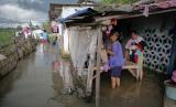 Seorang warga mencuci piring di dapur rumahnya yang terendam banjir di Pakuhaji, Kabupaten Tangerang, Banten, Kamis (20/1/2022). Intensitas hujan yang tinggi sejak Selasa (18/1) menyebabkan empat kampung di kecamatan tersebut terendam banjir dan mengakibatkan 660 KK terdampak. (FOTO : ANTARA/FAUZAN)