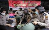 Sejumlah anggota kepolisian menyiapkan makanan di dapur umum di Pakuhaji, Kabupaten Tangerang, Banten, Kamis (20/1/2022). Dapur umum tersebut didirikan untuk membantu korban banjir di wilayah tersebut. (FOTO : ANTARA/FAUZAN)
