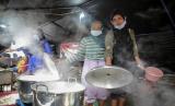 Warga menyiapkan makanan di dapur umum di Pakuhaji, Kabupaten Tangerang, Banten, Kamis (20/1/2022). Dapur umum tersebut didirikan untuk membantu korban banjir di wilayah tersebut. (FOTO : ANTARA/FAUZAN)
