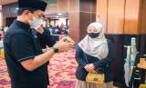 Head of LIKES & Education Group Yayasan BSMU, Aprilia Eviyanti (kanan) menjelaskan showcase produk binaan Yayasan BSMU melalui program Islamic Sociopreneur Development Program (ISDP) kepada Group Head Corporate Secretary and Communication BSI, Gunawan Arif Hartoyo (kiri), dalam ajang Grand Launching Talenta Wirausaha BSI di Jakarta, Rabu (19/1/2022). (FOTO : Dok. BSMU)