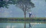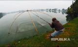 Suasana kolam Instalasi Pengolahan Air Limbah (IPAL) Domestik Cikoneng, Bojongsoang Bandung, Ahad (23/1/2022). Kegiatan warga di IPAL ini cukup beragam termasuk kegiatan menjaring ikan dengan jaring tradisional (nyirib lauk) ini. (FOTO : Republika/Yogi Ardhi)