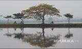 Suasana kolam Instalasi Pengolahan Air Limbah (IPAL) Domestik Cikoneng, Bojongsoang Bandung, Ahad (23/1/2022). Foto refleksi pantulan di permukaan air kolam kerap menjadi subyek foto pehobi fotografi. (FOTO : Republika/Yogi Ardhi)