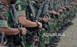 Prajurit TNI Angkatan Darat (TNI AD) wilayah Jabotabek mengikuti apel di Lapangan Monumen Nasional (Monas), Jakarta, Selasa (25/1/2022). Apel yang dipimpin Kepala Staf Angkatan Darat (KSAD) Jenderal TNI Dudung Abdurachman tersebut diikuti sebanyak 2.655 prajurit dalam rangka memberikan imbauan kepada jajaran prajurit TNI AD untuk mampu mengantisipasi perkembangan paham yang diklaim sebagai radikalisme. (FOTO : Republika/Thoudy Badai)