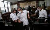 REPUBLIKA.CO.ID,TANGERANG -- Sejumlah terdakwa berjalan keluar ruang sidang saat sidang perdana kasus kebakaran Lapas Kelas IA Tangerang di Pengadilan Negeri Tangerang, Banten, Selasa (25/1/2022).