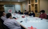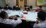 Ketua Umum Forum Zakat (Foz) Bambang Suherman (dua kanan) menyampaikan paparan saat berkunjung ke kantor Republika, Jakarta, Selasa (25/1/2022). Kunjungan tersebut dilakukan dalam rangka silaturahmi sekaligus menyampaikan terkait pengumpulan, pengelolaan serta penyaluran zakat di Tanah Air untuk meningkatkan kesejahteraan umat. (FOTO : Prayogi/Republika.)