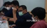 Ketua Umum Forum Zakat (Foz) Bambang Suherman menyampaikan paparan saat berkunjung ke kantor Republika, Jakarta, Selasa (25/1/2022). Kunjungan tersebut dilakukan dalam rangka silaturahmi sekaligus menyampaikan terkait pengumpulan, pengelolaan serta penyaluran zakat di Tanah Air untuk meningkatkan kesejahteraan umat. (FOTO : Prayogi/Republika.)