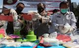 REPUBLIKA.CO.ID, SURABAYA -- Petugas memusnahkan barang bukti narkoba di Kejaksaan Negeri (Kejari) Tanjung Perak Surabaya, Jawa Timur, Selasa (25/1/2022).