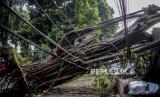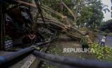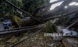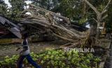 Warga berjalan di dekat pohon yang tumbang di Jalan Abdullah Bin Nuh, Kota Bogor, Jawa Barat, Selasa (25/1/2022). Hujan deras disertai angin kencang pada Senin (24/1/2022), membuat pohon tersebut tumbang hingga menimpa dua kios dan tidak ada korban jiwa pada peristiwa tersebut. Republika/Putra M. Akbar (FOTO : Republika/Putra M. Akbar)