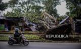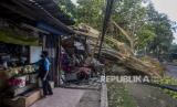 Seorang anak berjalan di dekat pohon yang tumbang di Jalan Abdullah Bin Nuh, Kota Bogor, Jawa Barat, Selasa (25/1/2022). Hujan deras disertai angin kencang pada Senin (24/1/2022), membuat pohon tersebut tumbang hingga menimpa dua kios dan tidak ada korban jiwa pada peristiwa tersebut. (FOTO : Republika/Putra M. Akbar)