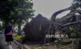 Warga berjalan di dekat pohon yang tumbang di Jalan Abdullah Bin Nuh, Kota Bogor, Jawa Barat, Selasa (25/1/2022). Hujan deras disertai angin kencang pada Senin (24/1/2022), membuat pohon tersebut tumbang hingga menimpa dua kios dan tidak ada korban jiwa pada peristiwa tersebut. (FOTO : Republika/Putra M. Akbar)